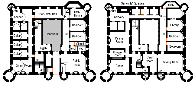 The Agnes Hotel, Smardogg![]() The Agnes Hotel: In the town of Smardogg this is one of the series of up-scale hotels in the Castello Chain established by the Italian immigrant Marcello Ponzini in the late 19th Century (after living in Glasgow for ten years, which explains his preference for Scottish women's names for his hotels). He started as a bistro cook and ended up as one of the great entrepreneurs of Estalia. There are a dozen or so of these castle-like hotels in various locations in the country, some of them built around older tower-houses, some built (like this one) new. They generally contain an inn or public bar, a bedroom/hotel wing, one or more dining rooms, and a tower that holds the more prestigious and expensive facilities. The Public House is called the 'Head of Ponzini' and has access to a Turkish bath on the floor above at the southern end of the loggia near the restaurant (the other dining room, the Great Hall in the tower, being for residents only). The plan here only shows the ground and first floors. There is a third floor to the hotel wing, and the tower itself is five stories tall. Ponzini himself lived in the topmost part of the tower in his later years. |