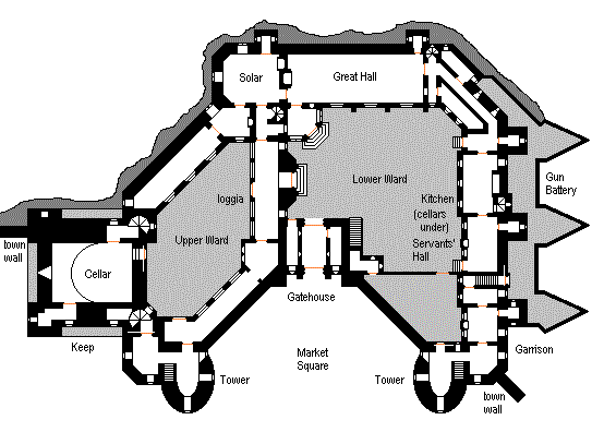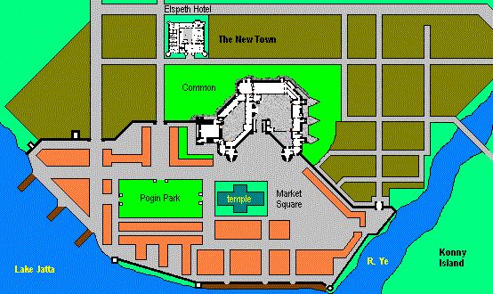 This structure was started in 1862 on the site of the original Pogin-mim compound that had been destroyed in 1840. It is primarily a show-piece designed in a neo-Gothic style, with a Norman-type keep (where the Pogin tower used to be) and French-style towers, but is also the seat of administration for the area on the east side of Lake Jatta. Baron Lar'min, from a distaff branch of the royal family, is the titular head of this sector. The Lord Mayor, Chief Constable, and Colonel-General are also important figures who have quarters here. Lar-min itself (see below) is the second largest town in Estalia, followed by nearby Smardogg.