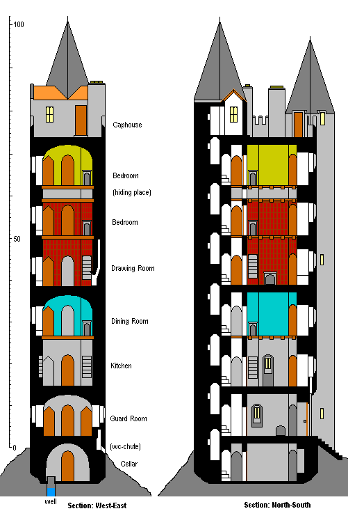 Although often used by the Archdukes as a retreat, the layout is very stark, consisting of one main room per floor, with several mural chambers. However, the dining room and sitting room are richly decorated and furnished, with linen-fold oak panelling in the drawing room. Accommodation is sparse -- two guards and a couple of servants (the large fourth-floor bedroom is the lord's private chamber, also oak-panelled, the one above, the castellan's, under which is a low 'hidden' area for storing who knows what, with access from below by a trap door). The watch rooms are also fitted out with bunk beds, as is the caphouse.