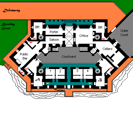 Suites are lettered A through E, rooms 1 to 13; lavatories are marked with a "w" on the plan -- these have been upgraded recently in the guest areas to contain hot showers (no coin in the meter either!), but for a full bath, please go to our bath house in the stable yard, which contains a sauna, hot tub, traditional baths, and a gymnasium. Even so, in most cases you will have to share a loo -- after all this is an English hotel. |