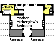 The ground floor (there is no cellar) is floored with stone flags. The front entrance opens directly into the dining room, but to protect against drafts there is a large wooden settle, designed by Captain Canute based on his sea-faring experience; it is seven feet high, with coat hooks and boot cupboards at the back and crockery shelving and sitting bench facing the dining area. The dining room has a sink overlooking an outside water cistern fed from the gutters. The hearth was provided with a Franklin stove. There is a coal or wood-buring fireplace in the drawing room, which also has the door to the back yard. Between the two main rooms is the spiral staircase built into a projecting turret. A small kitchen, a lavatory, and a larder/pantry complete the ground-floor layout. | ||