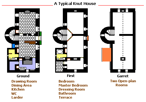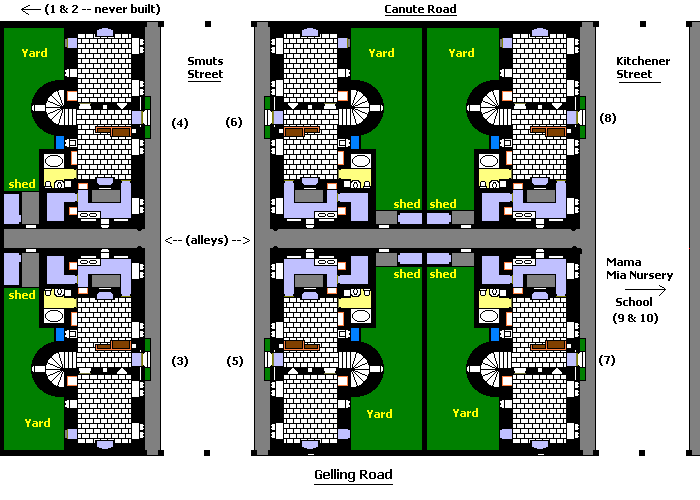 [ The Six Knut Houses just off Gelling Road, down Smuts and Kitchener Streets. North is to the right ]![]() First of all, notice the grid layout and the identical (save for mirror imaging) layouts of the buildings. Notice, too, how small they are and how limited the associated land. A typical Knut House will be described below. If they weren't so well constructed, one might imagine a concentration camp -- after all, that atrocity was invented during the Boer War -- but this was not Captain Canute's intention; it was rather to provide housing for destitute and solitary veterans who had served under his command. Numbers 1 and 2, which were never actually built, were to have been a pub/clubhouse and a small hostel for visitors, no doubt on a larger scale than the dwellings. Plans were for 24 houses altogether, but Canute ran out of money (see below). The streets are bollarded at both ends to prevent entry for cars and are paved with cobblestones -- features that along with the architecture are pleasingly aesthetic. One very obvious feature is the castellated tower-house plan of the buildings, small as they are, each fully defensible psychologically if not in reality. 'Every man's home is his castle' was in Canute's mind when he designed this project for his truly beleagured subjects. But each has its own back garden, because Canute, paranoid though he apparently was, believed in the therapeutic benefits of tending the soil.* In addition, Canute was his own architect, and as an amateur did not do badly, although the interior layouts could have been more sensibly arranged. | ||