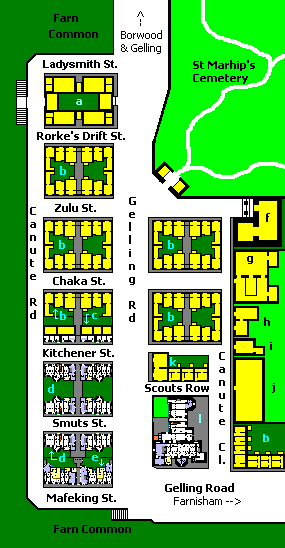 Captain Canute himself a few years before starting construction of the Knut Houses built his 'castle' (which is now a home for unwed mothers) across Gelling Road from the Farn Common land he later built the project on. It is another exercise of his architectural style and resembles the rest. It is a T-shaped, three-story stone building with projecting octagonal and square wings containing stairs and lavatories. The top floor was a dormitory for his pensioners. Unfortunately, to the north of this house on that side of Gelling Rd. there is a row of appalling yellow-brick workmen's houses and small shops, and up Canute's Close, the Grammar School and Baptist Chapel. Street Plan of West Farnisham