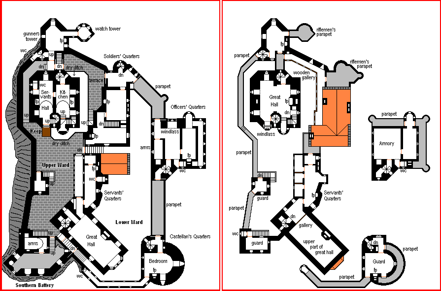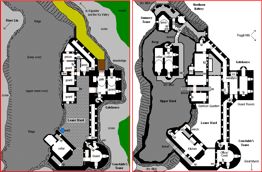 The lower ward is on a ledge on the east side of a limestone ridge; a crumbling granite scree slopes down into a densely wooded area along its outer side. There is a gravelled road leading north to the Ka Valley and the city of Kajudder. The entry is protected by a drawbridge, portcullis, and a two-tiered gun-looped wall passage. The soldiers' garrison occupies a three-storied building in the northern part of the lower ward. Officers are quartered in the three-storied gatehouse, and at the southeast corner is a four-storied D-shaped tower that is the residence of the castellan, whose title is Sheriff of Poggit with administrative, martial, and judicial duties for the whole area south of Kajudder. (He has an office/courtroom in the tower, and there is a small prison in the garrison quarters.) Between the gatehouse and the constable's tower is another two-tiered passage with gun loops; atop both of these walls is a wide parapet, and the southern outer wall (less exposed to attack) has one internal passage, a parapet, and a bartizan turret. Note also that the gatehouse and tower are also provided with defensive wall-walks. Entry to the upper ward is via two stairways, partially tunnelled into the rock, one leading up from the garrison quarters, the other from the south side of the kitchen/great hall building. The castle well is in the courtyard; there is a balcony leading from the kitchen that has a winch and bucket arrangement for drawing water, although for the most part the fortress depended on water from cisterns, as it rains a lot in this area. |