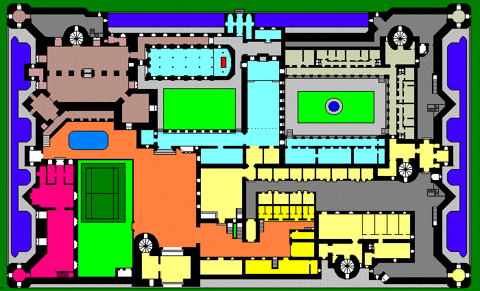 It is a pity that Almondsey disappeared in some sort of time warp or sank beneath the waves of the North Atlantic a couple of decades ago. We have recently found information about the Royal Palace in Gerousle -- not the old medieval castle that served that purpose for centuries, but the 18th Century neo-Gothic Baroque monstrosity constructed by King Lorenzo-Tzerplash the Fourth, and embellished by his great-grandson King Phlilph à la Biftek in 1893 (he added the Casino). The plan shown below is an image map -- move your mouse over different areas to see them described.