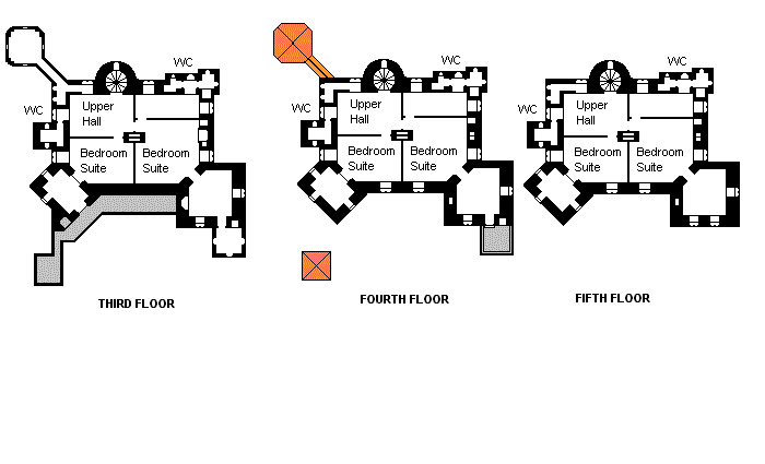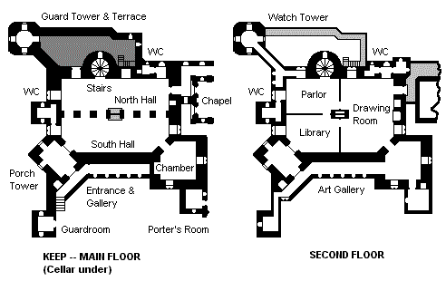 This is a rather elaborate structure, though not in the Ludwig of Bavaria class. The keep itself is six stories tall (see plans below). Defensively, this is a fairly weak building, as it is built on flat land and the so-called moats are basically decorative fish ponds; however, the Housecarls brigade, fanatical royalists, were housed in the southeast sector and more than made up for the rudimentary defenses. The stabling area, including carriage house, grooms's quarters, and provision barn, only held eight horses -- King Phlilph's extensive thoroughbread horse stables and race track are elsewhere on the estate (via the Garden Gate exit tower). The 'garden' to the north of the palace actually extends for something like 200 acres and contains not only geometrical flower beds, yew hedges (and a maze), a race track, a glass arboretum, but also a deep lake for rowing, swimming, and fishing. The kitchen and the servants' rooms along the north side of the garrison courtyard are rather extensive, given the size of this household when it was initially built. On the southwest side are the facilities the King as a sportsman set up for his own amusement, and for that of his richer subjects: The Casino and Bar, a swimming pool, and a tennis court. (There are also a bowling green, croquet court, nine-hole golf course, a cricket pitch, and a football field in the garden -- there was also a gymnasium for boxing, acrobatics, fencing, and cockfighting.) ![]()