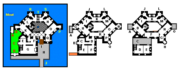 | Key: (a) Bath-house, (b) WC tower, (c) Kitchen garden, (d) Shed, (e) Scullery/Laundry, (f) Servery, (g) Kitchen, (h) Outer court, (i) Drawbridge to entrance, (j) Bridge, (k) Great hall, (l) Parlor, (m) Gallery, (n) Library, (o) Garrison hall, (p) WC tower, (q) Guardroom, (r) Closet, (s) Closet, (t) Private stair. | (a) Platform, (b) Balcony, (c) Servants' Parlor, (d) Service room, (e) Butler, (f) Housekeeper, (g) Office, (h) Business room, (i) Private office, (j) Strongroom, (k) Gallery, (l) WC, (m) Secretary's bedroom, (n) Watch turret, (o) Bureaucracy room, (p) Office, (q) Turret, (r) Guardroom/Servants' hall | (a) Platform, (b) Museum 1, (c) Terrace, (d) Men's dormitory, (e) Women's dormitory, (f) Museum 2, (g) Curator's office, (h) Turret, (i) Mayor's bedroom, (j) Closet, (k) Mayor's parlor, (l) WC, (m) Mayor's dressing room, (n) Museum 3, (o) Platform. Additional quarters for the Mayor's family are in the garret rooms. |