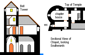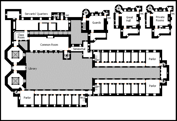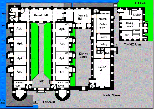 | Chapter XIX, in the city of Lotta, is the largest and last-built of the 19 'colleges' for priests of the old religion. These colleges (this is the only one shown on this web site) are actually lodgings for groups of priests, prebends,deacons, etc. and only occur in this county of Estalia. There are two others in the city of Lotta itself (Chapter VII and Chapter I), both much smaller, although Chapter I is the oldest and most holy. Chapter XIX has 24 separate apartments on three floors, as well as a Great Hall or common room, a chapel, a service wing, and a "Priests' Hall" for less important religious officials. It is on the Market Square facing the lake on two sides. There is an impressive frontage with two round towers. Also shown on this plan is the XIX Arms Inn, an important adjunct to any important structure in Estalia.