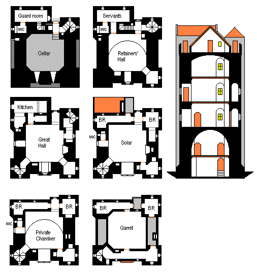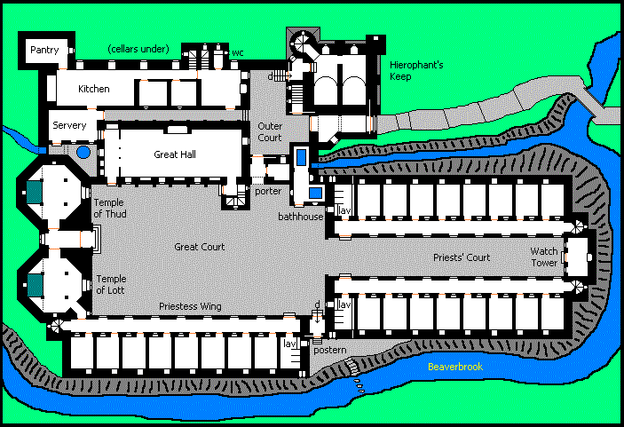 The Holy Sanctuary of Lignapp is the major monastic building in Estalia. There are quarters for 28 priests and 14 priestesses, the keep tower of the Hierophant, two temples, and a large common area. Servants' Wing is on the north side next to the keep. Novices sleep in the garrett over the common room. Note the rivulet that runs under the Great Hall, supplying water to the precinct. The keep is medieval (c. 1390), but the rest of the building, including the priests' quarters, are 16th Century, as are the temples.