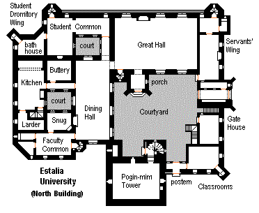 The University of Estalia is in the converted Pogin-mim precinct of the town of Lash-l'rou on the north shore of Lake Jatta. It is perhaps a misnomer to call this a university (at least by Oxbridge standards), but it is the main seat of higher learning (secular) in Estalia, emphasizing the sciences and literature. This campus, on the west side of town on a high mound, is the 'northern' branch, with residence for about 40 students and 10 faculty; there are annexe buildings in the town itself. The tower as been converted into classrooms, apart from the Solar, which is the Chancellor's residence. The library is located above the kitchen and dining hall (under which area there are vaulted cellars and a postern gate). Two stories of residence for students and faculty are to the north and south of this. The 'southern' branch is in Poolot't -- see below.