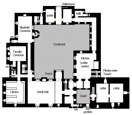 The building is basically divided up into four sections -- the southern range, consisting of the great hall and library (with the original Plimbo-mim tower, now the Chancellor's residence, at the east side), the Faculty tower on the west, which obviously houses the teachers (of whom there are about a dozen), the Student facility on the west and north (including the Bachelors' Hall in the Gatehouse -- semi-permanent members of the college), which houses about 50 people, and the service wing on the east side. Separating the great hall from the Plimbo-mim and kitchen is a small open courtyard with a postern gate. One should also note the music room behind the Minstrels' gallery -- this college is a small but important center for academic music, largely in the area of Estalian folk music and simple accompanying instruments such as harps, drums, and bagpipes. The front of the porch to the great hall has a very elaborate carved frieze panel, two stories tall, above the entrance arch showing important political events in the history of Estalia. |