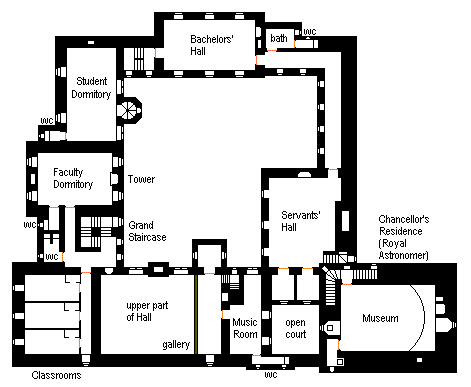 The University of Estalia, southern branch, is in the converted Plimbo-mim precinct of Poolot't near Estalia Castle. (It is drawn to a larger scale than its larger branch at Lash-l'rou, because it is architecturally more interesting; the college is smaller but more prestigious than the main branch, also.) 'Astrologer Royal' is misleading as a title for the chancellor -- in fact the post is the highest scientific appointment in the nation, and ranks with secretary of state. He is the chancellor of the university and chief of the entire public school education department. Although Estalia was never ranked very highly as providing secular public education, it does at least have such a department, which was established in the 1740's, and expanded 100 years later, over great opposition from the priesthood, who oppose literacy in all forms.