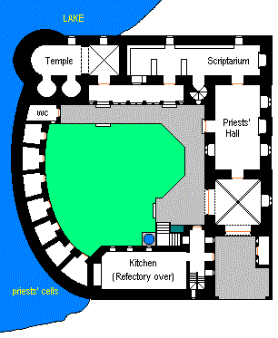 The Holy Sanctuary of Mugg is on the east shore of Loch Mugg. It is the repository of most of the ancient manuscripts relating to the gods Thud and Lott, and is presided over by seven 'monks' who live in ascetic cells along the lake wall, but there is also a priests' hall with a dormitory above for the use of visiting scholars. The temple and cells date back to the 14th Century, but the rest of the building, including the three stories of the scriptarium, gatehouse tower, priests' hall and refectory wing, were built at the end of the 16th Century.  |