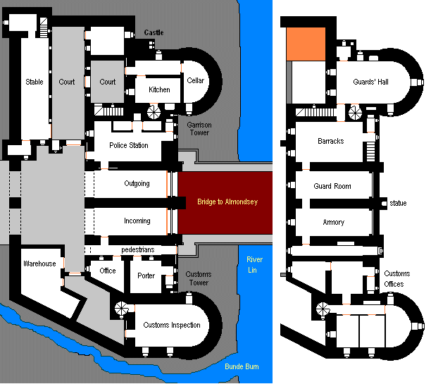 The castle is located on a promontory on the River Lin, nearly opposite the Almondsey fortified city of Kajudder. This strong place was always fortified in the past, but the castle dates mainly from the 15th to 19th Centuries, the keep, at least the southern part with its vaulted cellar and the two corner turrets, being the oldest surviving bit, along with the curtain walls, which pretty much follow the terrain to form an inner bailey -- older buildings within the precinct were probably of timber construction, along the same lines as the Great Hall and Kitchen arrangement that was reconstructed in stone about 1590 by Duke G'in the Bold. A 'modern' house was built around 1720 in what was the outer courtyard, where the stables used to be. Note the two wells, the westerly being original on the site, the eastern being dug out along with the construction of the 'house'. To the south of the castle is an extensive, unfortified outer ward, which contains all the outbuildings, brewery, bakehouse, stables, and agricultural constructions for a fairly large manorial estate mostly devoted to the raising of pigs and sheep. The underground cellars under the northern part of the house were excavated out of a prominent defile in the natural rock of the site, and in fact, the northeastern curtain wall dips into this area and extends some 30 feet farther below the top of the precipitous 40-foot cliff that surrounds the rest of the site that is in effect a small mesa of limestone. In the days before the house was built, the northeastern part of the castle was a gun battery, facing towards Kadjudder, and the watch tower faced downriver so as to spot any reinforcements sailing up to defend the enemy city. The gatehouse, keep, and watch tower overlook a 30-ft deep rock-cut ditch that also served as the quarry for the stonework of the castle; rising ground to the south explains the strength of these fortifications. A small turbulent burn provides a defense along the west and northwest sides of the precinct. The 'Holy Rock' in the courtyard is an ancient natural monolith, somewhat carved into the shape of a goddess in prehistoric times.