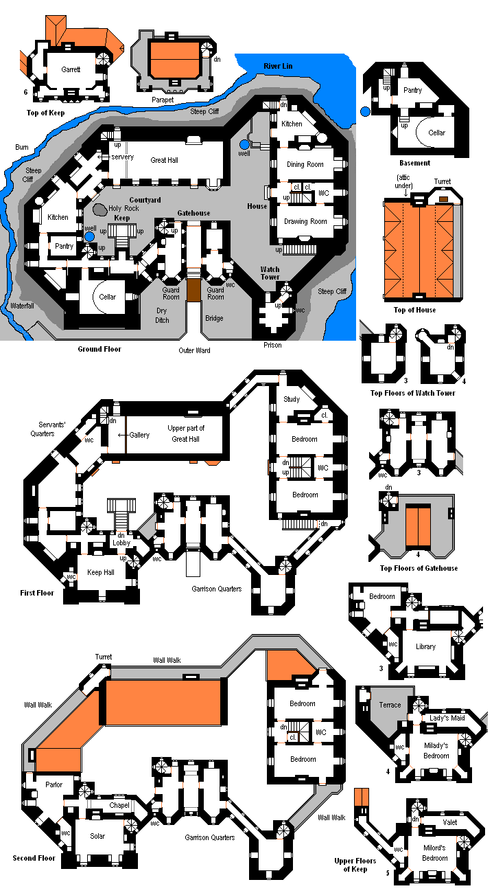 The west side of the courtyard is taken up with domestic offices, including pantries, kitchen, and servants' quarters. The north side has the two-storied Great Hall, with a mural staircase leading up to the 'house'. The east side is the house, containing the family living quarters, althought the keep itself has private quarters for the Lord and Lady of the castle. The gatehouse and watch tower on the south side housed the garrison. Note that the Keep is a self-contained building, with links to the rest of the castle; the Chapel is two stories in height, with a vaulted ceiling -- Lord G'in was actually a Christian, which is rare among the aristocracy of Estalia (well, actually he was a member of the Sect of Saint Thud, which was some sort of heretical hybrid religion). |