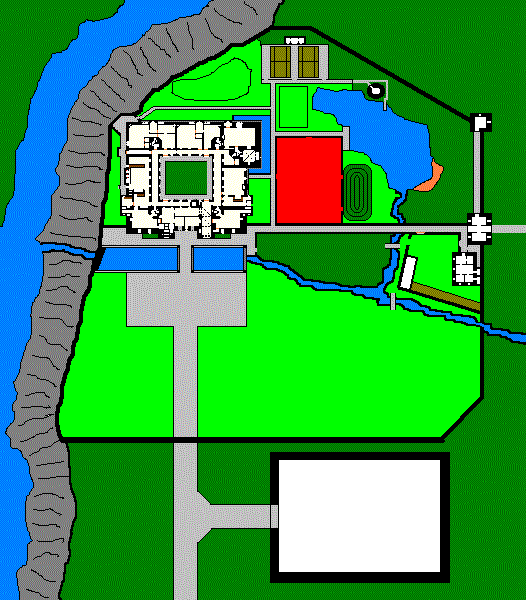 The Grounds of the Estate: The Ambul River runs along the west side of the promontory on which the precinct stands; the steep rocky cliffs are about 100 feet tall. Romula Riveret is the small stream that flows across the estate, feeding the lake and the moat, via sluice gates, then plunging into the river through the moat dam in a small cascade called the Romullin Gill. Across the river is an uninhabited lowland swamp-forest called the Poshmarsh. The grounds themselves (about 18 acres) are enclosed by a precinct wall 13 feet tall in places, with two gate-houses and three defensive towers, which are lived in by ex-military groundskeepers. On the north and inner ward side are the private grounds, which include (clockwise) a croquet pitch, two tennis courts and a pavilion, a bowling green, the 'Temple', the 'Mildlymirk' wooded area (gnarly oaks), the Woodiwose Tower (home of some very troll-like foresters), Forest Gate, Pondulac artificial lake (with its faked sandy beach bay for nude bathing), the Mummy Maze, and the Formal (The Rose and Cherry and Spice and Miscellaneous Lovely Flowers) Garden. On the other side of the inner ward wall is a gravelled pathway beside an apple orchard along the banks of the Romula Riveret. By the Forest Gate, where live his assistants, there is the gamekeeper's house and the estate kennels, where they breed a very nasty combination of a wolfhound and a pit-bull terrier, with strains of Doberman, Alsatian, and Labrador Retriever -- this breed, the Honeydew Mastiff Shorthair, has not yet been recognized by the official dog-breeders' associations in any country, mainly because they are untrainable to normal discipline, although they are very fond of old women -- have never been known to bite or mangle any woman of post-menapausal age even under provocation or being commanded 'Kill'.
