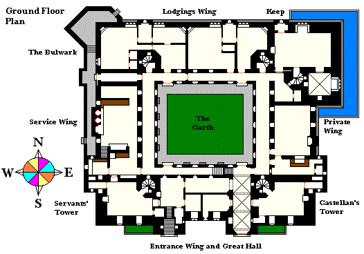 The ground floor is taken up on the west and south sides by 'services' (larder, kitchen, servery, scullery, servants' hall in the SW tower, and the estate offices. There are three entrances -- a slype leading to the promenade called the Bulwark, a porch stairway up to the Great Hall, and a vaulted passage (with the porter's lodge and a guardroom in the SE tower). The east side consists of a bar and a large game room, for billiards, cards, etc., leading up to the Keep tower, which at this level contains the library and a study; there is a 'moat', actually a goldfish-pond, around the base of the keep. The northern wing consists of private lodgings, including the children's nursery. In the interior of the building there is a grassy courtyard surrounded by a cloister. Note the four spiral stairs at the corners, two serving the towers for their full height, two the lodgings; the keep has its own separate staircase.