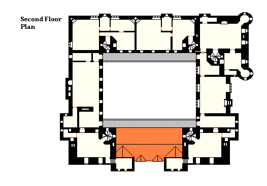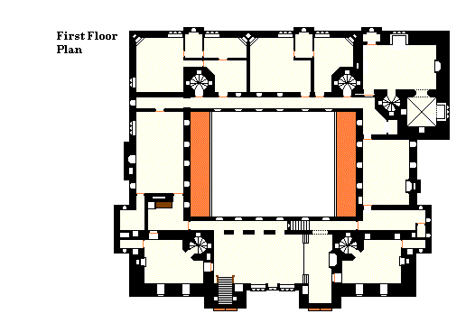 The first floor has another set of lodgings on the north, the main withdrawing room on the west, a private dining room in the SW tower, and the Great Hall along the south side. At the dais end (over the entrance vault) is a door leading to the butler's quarters in the SE tower. The east wing contains a trophy room and the lord's sitting room. This floor of the keep has the lord's audience chamber and a chapel. Along the northern side of the cloister is the Long Gallery, with many paintings. Note that the cloister passages on the east and west sides are not continued at this level. Main entry to the Great Hall is from the staircase to the outside of the building, but it is also accessible to the kitchen by way of the small dining room and an arcade into the cloister passage via a servery area (with a dumbwaiter) into the withdrawing room; in addition there is a staircase to the lower cloister passage leading down from the dais directly to the service wing.