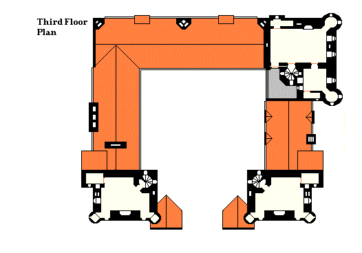 The southern towers are occupied at this level by the housekeeper and the castellan, respectively. Between the two, apart from small turret closets, stretches the roof of the Great Hall (which room is the equivalent of two stories tall). The northern and southern cloister walks at this stage are roofed over to form a kind of parapet walk overlooking the Garth. A long room on the west side is a dormitory for housemaids with a linen closet/sewing room at the north end (male servants, apart from personages such as the butler and the castellan live elsewhere on the grounds of the estate, over the stables and in the Outer Gate). The lodging wing, as usual, contains a suite (two bedrooms and a sitting room) at the west, and two bedrooms at the east. North of the castellan's room is the armoury, or gun room.