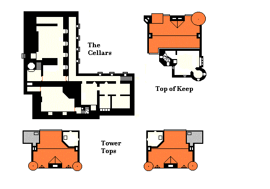 Miscellaneous: (a) The cellars are in the SW side of the building where the stony bedrock slopes and makes it practicable for such. They are in three sections, each with a separate staircase access. Under the kitchen is the main provision cellar and the well room (the well is some 150 feet deep, carved out of nearly solid rock). Under the great hall are the wine cellars and the game store. These two sections are connected by an L-shaped passage under the cloister that also is lighted by sunken windows. The basement of the tower is called the dungeon, although it is actually used as His Lordship's 'play room'. (b) Tower tops -- each of the flanking towers has a cap house over the spiral stairs and a parapeted terrace over the bathrooms, accessed by ladder and hatchway. (c)