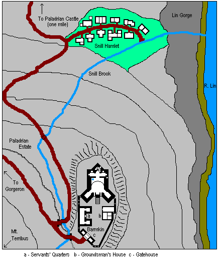 This is a very small but tall and unusual-looking tower house at the top of the Lin Gorge, guarding the southern entrance to the grounds of Paladrian Castle. It is only 30 by 34 feet appx. but over 100 feet tall. The most characteristic feature is the three pyramidal towers, or 'spikes', symbolically referring to the trifold wrath of the Mother Goddess Lott [Lough't]. (The large one over the stair turret had rotted away by 1923, as the main support was timber, with stone cladding, so it and the other two spires were reconstructed with steel girder supports.) As the tower is on the north flank of Mt. Teribus, the highest peak along the Lin Gorge, it lours over Almondsey across the river. There is a very small barmkin, or courtyard, with buildings for servants, on the southern side of the tower house. Farther down the slope is one of the few hamlets in the Lin Gorge, Snill, which houses several of the Paladrian Estate workers. (There is a pub, of course, the first house on the left.)