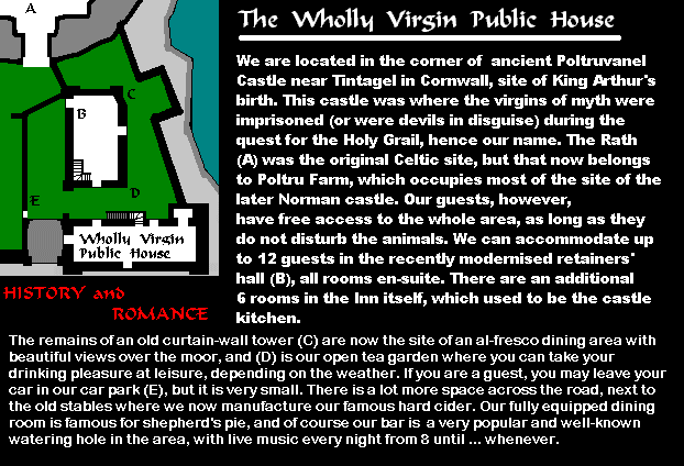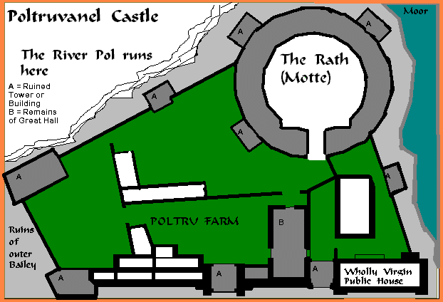 (One side of the farmhouse includes a truncated portion of the gatehouse tower, and the remains of the Celtic rath are used as a sheep pound. What is left of the kitchen range is now a popular pub, called "The Wholly Virgin," which is noted for its shepherd's pies and hard cider, brewed locally in the old castle stables.) Want to see
