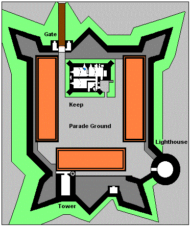 Fort Hazard (Salammy Castle) -- The premier fortress of this area, built on the Salammy Head promontory at the east side of the south coast of Estalia. It is an artillery fortification along the lines (rather primitive) of a Vaubin fortress, and also has a lighthouse, which was built 100 years later, and a keep tower built at about the same time (1820's). The keep was built to accommodate the contemporary Duke of Marchland, who was very much into Napoleonic matters and wanted a place where he could 'play soldier' -- it is rather a sham, militarily, mainly built for comfort. The surrounding ramparts, and the barracks on three sides of the parade ground, are rather formidable, but there is very little in the way of outworks and flanking batteries. This fortress was regarded with contempt by the Almondese (since it does not really protect anything), and was never assaulted.