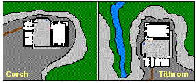 Fowlix and Yivil are located in the marshes of the Vale of Vole; Tost and Flar are in the highlands overlooking the Almondsey port of Glabbay; Corch and Tithrom (see below) are in the northern highlands overlooking the county of Linzonia (whose inhabitants are less trustworthy than the Almondese). |
