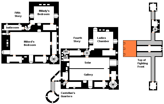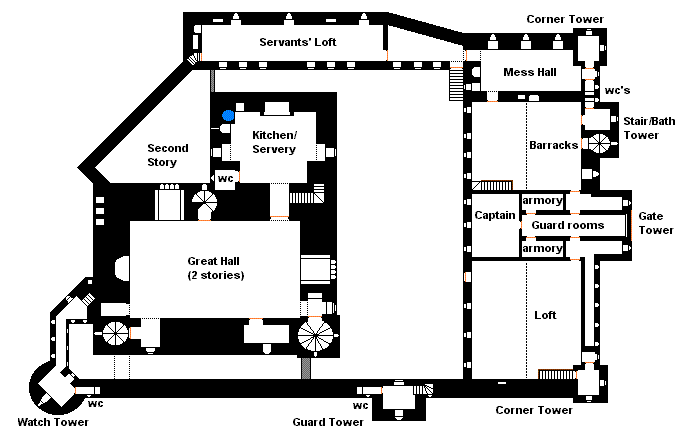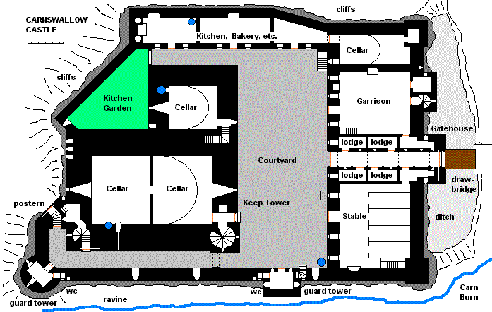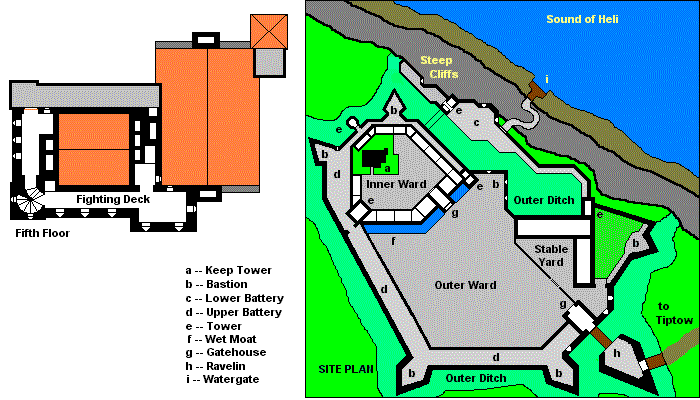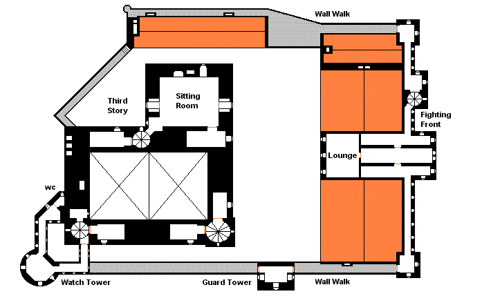 ![]() AlmondseyCarnswallow and Lickerbill Castles, EstaliaCarnswallow Castle is the country seat of the Earl of Pagota. It is located in the hills to the east of Tiptow, and is noted mainly for its huge keep tower. The castle dates mainly from the late 17th Century. Sited on the edge of the escarpment, it is a well-protected stronghold with fine views to the west. Beyond the drawbridge is the home farm and a small hamlet housing servants and retainers (and of course, a pub). Refer to the floor plans for a description of the various rooms and towers. The quarters in the keep tower are particularly well furnished and opulent. ![]() ![]() ![]() ![]() Lickerbill Castle is the strongest fortification in this part of Estalia and is on a commanding site on a headland above the town of Tiptow. The tower house is a particulary fine building (constructed originally about 1660, but considerably 'improved' in the 18th and 19th Centuries as a residence for the Earl of Pagota); it is enclosed in the Inner Ward -- service buildings surrounding a courtyard -- which is built on a small 'tor', being the highest spot in the precinct. The Outer Ward contains the barracks, armories, etc. for the garrison -- the buildings are not shown on the plan. There are two levels of artillery defense on the seaward side (the lower battery being reached by a tunnel from the inner ward), one on the landward, and a provision for cavalry patrols. ![]() ![]() Click here for the town of Tiptow |