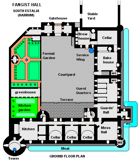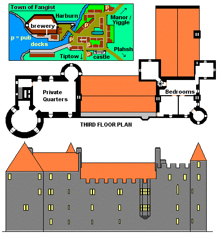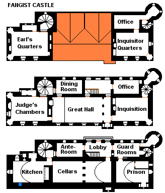 | Fangist Castle. This is the administration building for the county of Harrum. Not strictly a 'castle' -- more like a stone 'hall-house' -- it nevertheless serves as the primary government center of the county. The Great Hall functions as a courthouse, wedding and funeral hall, and banquet room. There is also the police station and a prison, with the religious Inquisitorial chambers above, and the usual bureaucratical offices (marriage licences, fines, etc.). The Earl's quarters and Judge's Chamber in the western tower is supposedly available for Earl Harrum, but in fact is used by the Magistrate of Fangist, the leading politician of the area. It is well-known that the normal Inquisitorial appointee is very tolerant about offenses related to drinking and horse-racing -- just as long as one goes to Temple on proper occasions and does not take the names of Thud and Lott in vain (but of course, no Christians or Muslims are tolerated in the area).