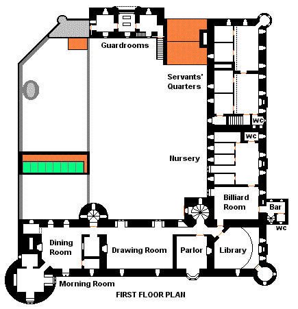 Description: First Floor. When the original castle was remodelled in the 19th Century, the old Great Hall was subdivided and converted into the drawing room and a snug parlor that has a corbelled-out oriel window; the Solar became the dining room, with a wine store, an alcove for the silver, and a servery. A private room in the round tower became the morning or breakfast room with an adjoining room for storing china. The library in the east tower is vaulted as protection against fire -- it contains some very rare old books and has an attached reading carrel in a small round turret. The tower wing contains the nursery for the children but also, oddly enough, the billiard room and a bar for his Lordship. Servants lived in the northern part of the building over the bakehouse and grain cellar (inconveniently, they had no direct access to the main rooms except via the courtyard entrances, but security was always a problem in Estalia). A very tough set of guards occupied the gatehouse, which has a watch room and battlemented terraces on the floor over this; there is another protective terrace on the west side with a roundel overlooking the ravine. |