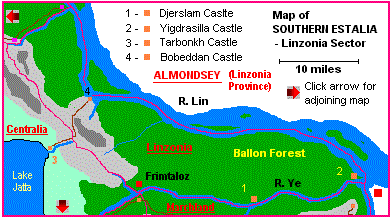 There is very little to describe about this mysterious territory, since it is hardly ever visited, let alone studied. There is one central 'town' (if it can be described as that) where Linzonians meet with Estalians on the few occasions they need to trade or have diplomatic dealings: that is the town of Frimtaloz (see below). There is also Djerslam Castle, seat of the most sophisticated of the so-called ruling class. And there is the sad ruin of Yigdrasilla Castle, which was an attempt by the medieval Estalians to establish a seat for the conquest of this group of tribes. Of special note is the mysterious castle of Bobeddan. |