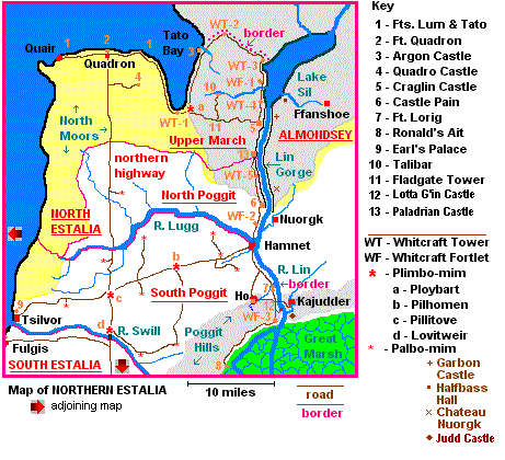 Consists of three counties: Upper March, North Poggit, and South Poggit. Sparsely populated in the north, which is mostly moorland, and mountainous (the Argon Mountains) along the Lin Gorge and Lake Sil to the east. The west coast is gale-swept and treeless although an inland ridge protects the valley of the River Lugg. The Poggits, however, are mostly agricultural, especially in the Vale of the River Lugg. The Poggit Hills bordering the Great Marsh are mostly sheep raising. There are only three towns -- the port of Quair, Hamnet, and Tsilvor at the mouth of the River Swill -- the rest of the population centers being 'Plimbos' (4) and 'Palbos' (10) (see towers), mostly in South Poggit. Almondsey is across the River Lin, hence the emphasis on fortifications, including Quadro Castle, the Whitcraft Towers, and the north coast (Lum, Quadron, and Tato) and river forts (Craglin, Pain, Ft. Lorig, Ronald's Ait, Paladrian Castle, and Hamnet), plus the castle opposite Kajudder, Lotta G'in. Argon Castle protects the northeastern side of Tato Bay. Hamnet is the capital of North Estalia -- see its web page. There is also a page describing the Earl of Poggit's palace at Tsilvor, and one for the holy 'city' of Talibar and its castle Fladgate; note, also, the seminary at Fort Lorig.