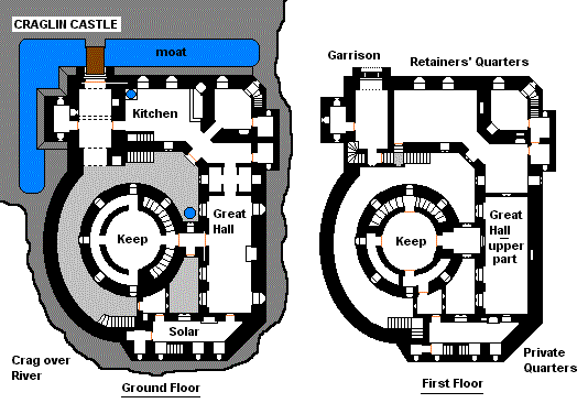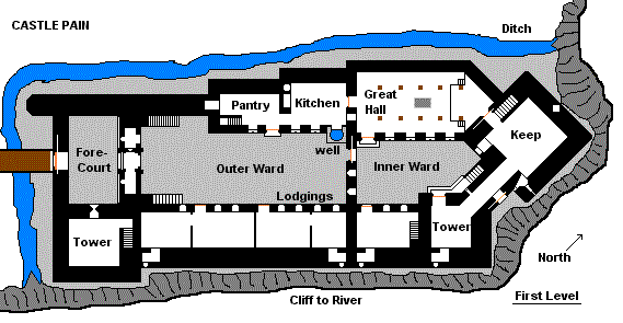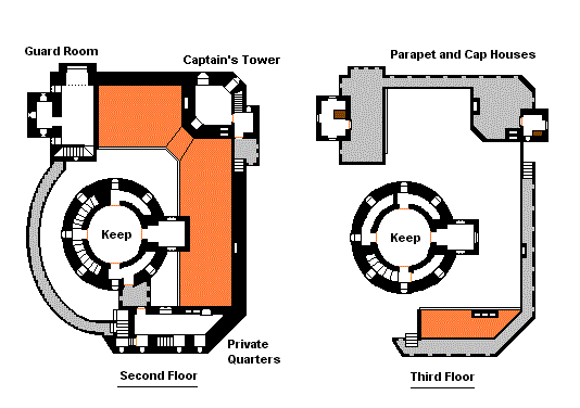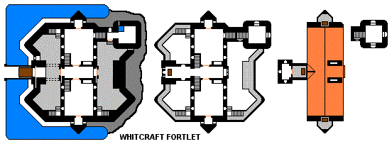 ![]() AlmondseyEstalian River FortressesThe upper reaches of the River Lin mark the eastern boundary of Estalia with Almondsey. South is the Great Marsh and east is the Lin Gorge. Although usually on much older sites dating to the Dark Ages, the fortifications along the river were mostly refurbished under Himzip-tol-Ten's Estalian Renaissance of the 17th Century. Castle PainThis was a very old Estalian fortification dating back to the 800's, but it was substantially rebuilt under Himzip-tol-Ten, utilizing the same simple linear plan and the very thick stone walls of the original. The main additions were the lodgings for the garrison in the outer ward and the modernization of the great hall and kitchen area; also, the towers were heightened and strengthened to support cannons on their roofs. Castle Pain was always just a military site, not part of the theocratic government (although there was of course a resident Inquisitor and a couple of Enforcers). It was badly damaged by bombardment by the Almondese from Nuorgk in the late 1700's, especially the south curtain and lodgings, but was restored when Count Poggit of Hamnet Bridge established North Poggit county* in those turbulent times. It is now his capital seat with its nearby, unauthorized, but rather large village ('Pain'). The name derives from the old Estalian word for rocky place. There is a Whitcraft Tower (WT-5), now a personal keep for the Counts, four miles to the north, where there is a gap in the Lin Gorge.* North Poggit county seceded from Poggit County during this turbulent period. It is an impoverished land, in fact has only one Palbo village, far west by the northern highway, but it has survived as a sort of Siberia/Rhode Island for Estalia -- lot of back-woods communes and things like that, even up into remote areas of Upper March county. The capital is the adulterine village of Pain, located outside the castle drawbridge, and contains the moot hall and ducal palace (both timber structures). ![]() The entire building is built within the original ditch and embankments of the Dark Age fort along a natural cliff by the river on the south and east. The walls and tower foundations are also original, although refaced with mortared ashlar and grouting poured into the old dry-stone walling. Note the three curtain walls separating the linear layout: An outer wall, or barbican, with a drawbridge, leading to a forecourt, a two-level curtain wall with portcullis leading to the outer ward, and a smaller wall enclosing the inner ward with its keep tower and great hall. There is very little effort to provide flanking cover, the main defense being the very thick walls, the artillery towers, and of course the treacherous river in its gorge. There is a sallyport leading down to the river next to the keep tower. To the north lie thick, untravelled woodlands. ![]() Great effort was made to provide for the comfort of this remote and dangerously located garrison: a kitchen/pantry (with cellar under, and dormitories for servants over), a two-level building containing four separate 'lodges' on each floor, and a two-story great hall with pillars and a gallery. Oddly enough, there are no fireplaces, except for the kitchen stove and oven and the open hearth in the great hall; presumably, braziers were used elsewhere. The gate tower is totally defensive -- guard rooms and the gun battery atop the vaulted second floor. The captain of the garrison lived in the rooms next to the tower in the inner ward. There are no less than nine garderobes along the river wall. ![]() The parapets atop the very thick curtain walls are in the 'German' style -- that is, roofed with a timber trellis-work on the inner side. On the most protected side of the fortress is the double keep tower (a large square building and a secondary lower one, which is also a gun battery, connected by a mural passage). It is presumed the lower floors of the gun tower were for the use of the religious officials. The keep was reserved for visiting nobility and upper-echelon military staff, but has a large gun battery on top and a watch tower at the eastern angle. Ronald's Ait CastleAt the top part of the Great Marsh on the edge of the Poggit Hills there is this small fortress on an island in the main channel of the river. Impractical as a defense against an uncrossable border, it is also pretty much impregnable; it was a posting for generals in disgrace -- such as Lord Ronald of Polycampo, after whom it is named. It consists basically of a keep tower and a gatehouse complex for the garrison, connected to the mainland by a wooden bridge and otherwise accessed by water landings for small boats. It was never captured, or even besieged, but is in a very dilapidated state, and still serves as a place of exile. There is a Whitcraft Fortlet (Fort Poggit) to the north, also along the swamp.![]() Craglin CastleBuilt on a high crag overlooking a bend in the river, in the Lin Gorge, this castle was probably a Dark Age site -- possibly a broch and rampart along the lines of the current keep tower and curved wall -- but nothing remains of that. It is no doubt the most dramatic-looking of the Estalian river forts, although it is not very large. It is the seat of Duke Craglin of the Upper March, and as such has rather more elaborate accommodations than usual. The fourth Duke was a famous necromancer, hence the mysterious rooms in the upper part of the keep. There are three Whitcraft Towers to the north of Craglin (including L'mozzian's Tower, which is the northernmost) and one to the west, as this is the northern frontier. The Duke also has a tower-house (Fladgate) protecting the Holy City of Talibar located along the road to Quadron.