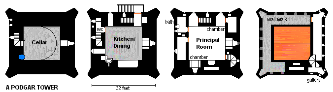These small squat three-story towers were built in various places in Krumshire (there were ten of them originally, although four have been abandoned) by the Sagasity Syndicate in the late 18th Century. They are rather primitive, housing a small garrison of 4-6 men normally, but strategically located to protect the county. Note that four of them are on the Pagota border, since these two counties in the same province have not always gotten along together; Pagota itself did not bother to reciprocate, as they have a very effective cavalry. The towers have extremely thick walls and only three principal rooms -- cellar, kitchen/mess hall, and the main hall chamber -- with two sleeping cubicles, a covered gallery also used for extra accommodation in time of alert, and a bathroom (luxury for this sort of place). Each has a well in the vaulted cellar; also a wide parapet walk holding small cannons. Entry is only by a wooden staircase to the second story. Their function was very similar to the Martello towers being built in England a few years later, and were actually far more effective than larger castles for dealing with minor incursions from Almondsey. Of course they could not withstand major attack with siege artillery, but never had to face it. For the most part, they served as refuges for the local satraps and priests in the face of raids or civil disturbance. They are actually quite snug and self-contained, and most have been incorporated into farm complexes. A similar, but earlier, series of towers, called Ragouts are along the Almondsey border and not covered on this web page. |