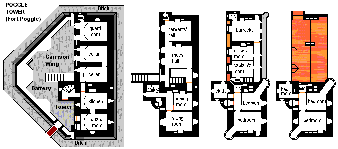 This fort at the mouth of the River Phli was built in the mid-18th Century, incorporating an older tower house built a century earlier. The nearby small village of Poggle is the main fishing town of the county and also a 'seaport' for the export of agricultural products, but it is a very small place of little importance except locally. The main feature, apart from the rather fine tower house, is the three-gun battery. This fort is still garrisoned (but only 8-12 men, a sergeant, and a captain).