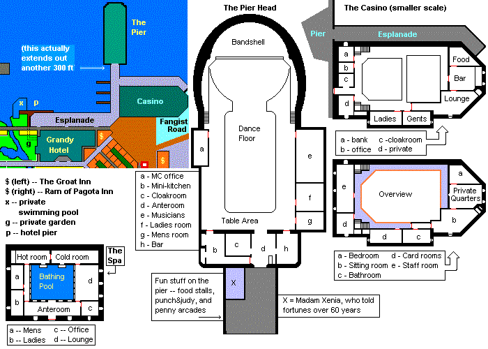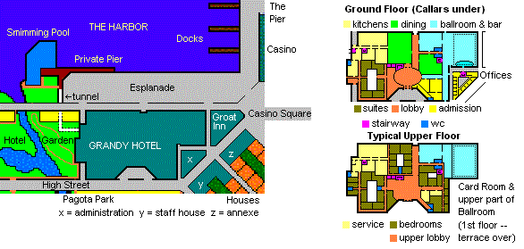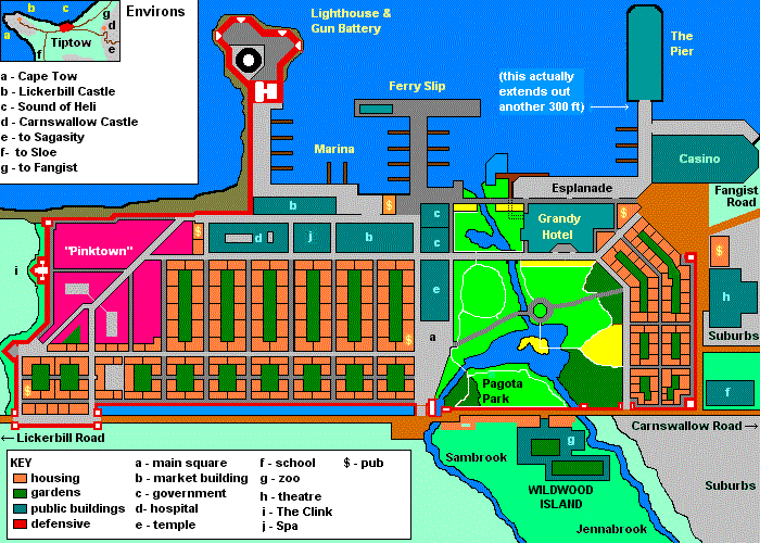 ![]() AlmondseyThe Port of Tiptow, Estalia![]() Tiptow became the largest town in Pagota, although it started out as a simple fishing port and ferry terminus for the service to Algoland (which it still is, but no longer a fishing port -- the latter having been moved to a small hamlet along the Fangist Road). It had a strategic location, as the older nearby castles of Lickerbill and Carnswallow testify, as do the gun battery and lighthouse, but did not become prominent until the very late 18th Century when the Earl of Pagota returned from a five-year sojourn in England, having spent time in Bath, London, and Brighton. He pretty much tore the old town down and built this fine Georgian resort, including a spa, his greatest accomplishment the terrace housing (colored orange on the plan), which owes a lot to the architect Nash, but is very monotonous with its light-gray ashlar walls. "Pinktown" -- the older section within the main fortifications -- was left with the original 17th Century buildings, to house the serving classes, and 50 years later, under his grandson, who was a debauchee, was exempted from controls and became the 'red-light' district of the town during an anarchic period. (Note, however, the large tower on the west side, which is the police station and 'clink'.) As a devotee of Monte Carlo, he also built the Casino late in his long life, now the largest legal gambling palace in Estalia. His descendents, in turn, built the Victorian-style pier, with a ballroom, the theatre (rep company and small opera), and the boat marina (at the same time modernizing the ferry slip).