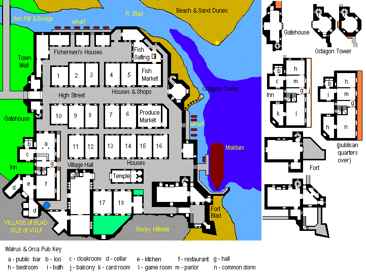 This is the east coast fishing village and port for the island (population about 200). The south side abuts into a steep hillside and has cellarage carved out in what were originally caves. Village is protected by Fort Blad (ca. 1830), the gatehouse (also serving as the constabulary), a low town wall, and the Octagon Tower (which is the customs house, if such a term can be used). There is mooring for several fishing smacks as well as for the principal freighter, the 'Maldam'; while moorage is bad here as on the rest of the island, it is at least protected from the westerly gales. Fishing is the main industry, hence the salting rooms. The two-storied Village Hall contains the official amenities -- moot hall and government offices. Fort Blad is a simple structure housing a garrison of 20, and boasts a large cannon, Big Brum, on its main turret. Houses 17 and 18 are the 'mansions' (constable/magistrate and alderman/chief honcho); number 13 is the priest house. What is most notable about this village is the 'Walrus and Orca' Inn, the largest and finest on the island. The entire village was built under contract on the site of a smaller settlement in the early 19th Century, and was done by a single itinerant architect, Jospet Malrowe, who had little design talent but had the good sense to build everything of well-cut limestone -- a very appealing place now, aesthetically, with high hills and cliffs as a backdrop and sandy dunes in the foreground. Bridge over Gon Rill leads to the main agricultural land on the island, fertile area even with eastern exposure (potatos, rye, turnips, and pigs sheep mainly).