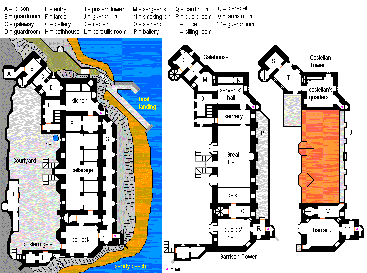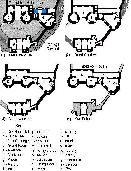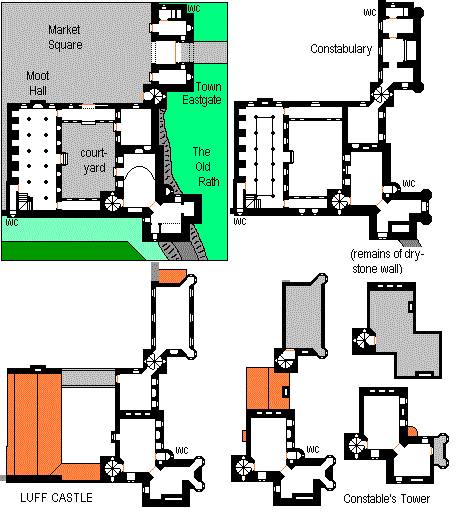 A tower house was built in 1697 atop the wall of the aboriginal rath or fortress at Luff, still inhabited at that time. It served as an administrative headquarters for the island, which was then very wild and lawless. Within 20 years it had been extended to the west, with a courtyard and a large building serving as a court and meeting hall, and a temple to Thud and Lott west of that. During this period the western portion of the rath was built over and walled to form the village of Luff. A gatehouse was constructed as an extension to the north of the castle; this became the constabulary building, containing a lockup (south of the gate passage), quarters for policemen, and a courtroom on the top floor. The Chief Constable himself, then the most important official on the island, occupied the tower house. |