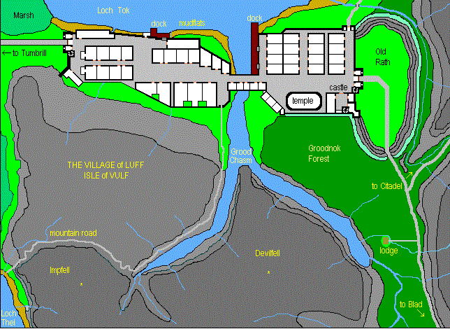 Luff was the site of the aboriginal village in prehistoric times; remains of the 'rath' or earthwork fortification with dry-stone walls are on the east side, and the enclosure is now used as an animal pound. West of the Rath, a small walled town was built starting in the late 17th Century, butting into the rath wall and overlaying its western wing, with a small castle serving the function of a Palbo-mim (now the HQ of the island constabulary) and a temple. A hundred years later, Jospet Malrowe constructed the western extension of the village and the fine bridge with houses along its southern side. The entire population of the inner parts of the island makes this their market town -- they number about 250 souls at the most. As late as the 1740s, most of the island people inhabited the center parts, living on the fells and on crannogs in the lakes, but their numbers were severely reduced over the years as they were compelled to move to the seacoast villages to work as fish processors. To the south is the Groodnok Forest, the only large woodland on the island, the mountainous Impfell and Devilfell (1200 and 1600 feet, respectively), and one of the most dramatic features of Vulf, the Grood Chasm, a fiord-like extension of Loch Tok. Where the two forks of the chasm come together, there is a spectacular 800-foot-high crag, nicknamed the Lorelei Rock -- its native name being the unprounceable Thud'yaftakernil'mermim'gobolum ('great swollen phallus of the lord Thud, ruler of the goddess') -- after the Rhine River island. There is an elaborate hunting lodge along the eastern fork of Grood Chasm in the midst of the forest, which is well populated with boars and badgers, foxes, and some deer.