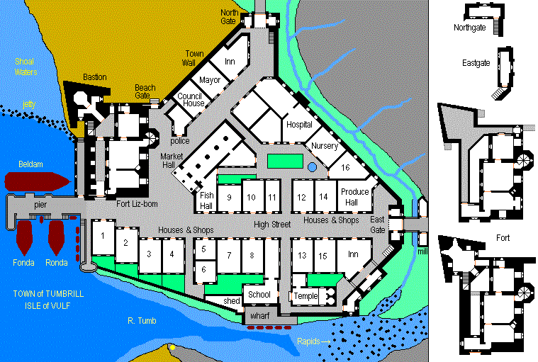 This is the principal 'town' (population about 300) on the island. It is the main harbor, although the constant gales from the west make it difficult (but the rocky shoals, if you can avoid them, mitigate the vicious offshore currents and surf and the river mouth is easy to reach in low wind conditions). There are three home-based ships, as well as a small fishing fleet: 'Beldam' is the main freighter, and is supported by the smaller 'Fonda' and 'Ronda'. Fort Liz-bom, dating to about 1790, protects the anchorage; the fort has a very powerful cannon, 'Blue Ben', on its main bastion -- it was bought second-hand in the 1890s from surplus artillery from Portsmouth, England. There was in ancient times a landing where the wharf is along the river and a path along the road out of Eastgate up to the aboriginal main settlement at Luff. Tumbrill itself was developed by Lord Axelmotembul and designed by his hired architect Jospet Malrowe in the early decades of the 19th Century -- he is responsible for the limestone buildings and town walls, all in a plodding but consistent style. A mill stream outside the east gate produces the only flour on the island, and other grist, most grain crops being grown in the small area beyond the north gate, the rest imported whole. East and North Gates house pensioned-off soldiers who are not so decrepit as to end up in the town nursery, which hosts indigents at the beginning and ends of their lives.