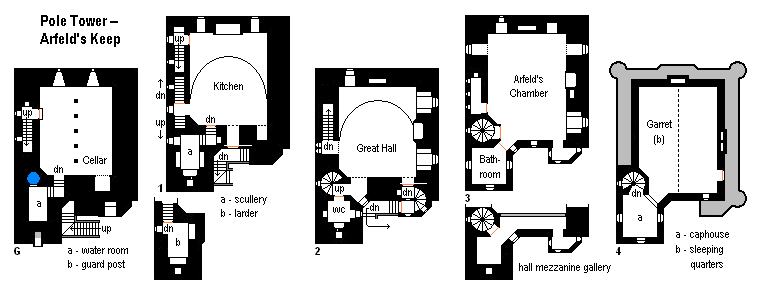 The Inner Ward is the castle proper, containing all the living quarters for a great lord: originally, the Estalian Duke of Yarthfur, later, the Almondese Marquis of Yarthland. The oldest building is the six-story round Keep tower, dating from about 1230 on an even older foundation; it is now the Chapel and primary watchtower. Entry to the ward is through a large four-storied gatehouse with two portcullises that houses guards and the upper servants (butler, for example). Access to all upper levels of the keep and gatehouse is via a spiral staircase in an annex building built around 1500, along with the New Hall and Solar, replacing older timber structures. A latrine tower and the New Hall connect the Keep with the Constable's Tower, which originally was built c. 1350 on the site of an older watch tower. The Constable's Tower was extensively remodelled when the New Hall was created, and now this unit forms a small but impressive little mansion. After the Almondese occupation, yet more modernization was done, including the insertion of a large staircase in the old Great Hall, which was no longer being used for its original function. The upper floors, not shown on the plan, are residential -- the northern wing ('new hall') rises two more floors, and the Constable's Tower is five stories tall.