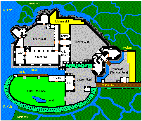 Tram was built on a gravelly bank in the middle of the marshes along the River Vole, on its east side. It was the stronghold of a cousin of the Duke of Yarthfur who became a renegade but eluded punishment all his life (he lived to be 93, died in 1450). He took this ancient stronghold -- it had been a fortified site since the Dark Ages -- and built a strong, but rather simple, castle. His main contributions were the earthwork embankment for holding livestock (often rustled from other areas), and the basic curtain wall of the Inner Court. His son constructed the two octagonal towers, west and north sides, which became private quarters for family and upper-level servants. He also did a major remodelling of the Great Hall and Solar complex, creating a moat/dock for loading and unloading livestock, which was mostly goats and pigs in this area of the country. His grandson -- by then the title of Baron Tram was officially established -- Lord Huronim Ples, was a very successful freebooter on the Spanish Main in his early years. When he retired home on the death of his father (who also lived into his 90's, this being a long-lived family), he built the incredibly large keep/gatehouse, a very elaborate structure for a dinky little castle like this. In 1667, after the territory was annexed by Almondsey, it was assigned to an Almondese knight who had married the daughter of the deposed baron, so in effect this castle still belongs in the same family. It is the main central
