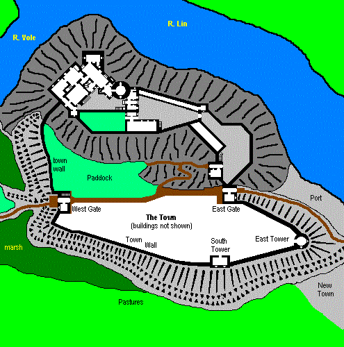 The great craggy hill on which there has been a fortress for over a thousand years rises from southeast to northwest to a height of 360 feet above the River Lin where the Constable's Tower is located. Nothng remains of the original dark-age fortifications, except for the site layout itself. The three wards, or courts, of the castle are built on flattish areas at ascending levels from Outer, to Middle, to Inner. The Outer Ward houses the garrison, as this outermost part of the castle needs the most protection, as does the town below it. Entry is from a three-story gatehouse with a portcullis facing a steep road up from the town. The eastern wall of this ward was converted into a gun battery by the Almondese to protect the harbor outside Eastgate. The Middle Ward housed the lesser servants, stables, and other outbuildings (including a smithy); it is very lightly defended except for a plain four-story square tower with internal access by ladders. There is a paddock for the horses underneath the south wall of the Inner Ward.