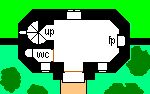 The manorial grounds are some 90 acres; only the eastern part is shown here (north is high moorland ground, south is a steep meadow, including a tennis court, leading down into the valley of the River Esk, and west is forested dale). To the east of the manor is the stable yard, with a barn, stable, carriage house, and a cottage for the grooms; a hundred yards along the road is a pub, The Optipal Arms, and a few houses, but hardly a village. North, under the slope of the fells, is the kitchen vegetable garden, horse paddock, and pond. A small tributary of the Esk, Bounderbrook, has been dammed to create the livestock pond and the garden lake. The formal garden is worth seeing -- it has been open to the public for several years. One must park one's car beside the garden wall along the narrow road. Nearest the house is the rose garden, a croquet lawn, the fountain (with some very strange 'reverse mermaids', women's bodies, fishes' heads), the lawn bowls court, and the closely cropped Great Lawn, which leads to a forest of holm oaks that contains some sylvan suprises in the form of scuplted satyrs and centaurs and a 'gingerbread house'. To the west of Boundbrook is the double-oval maze, plan shown below. Around the lake there are four buildings of note: a two-storied Gazebo set amidst pear and apple trees, a boathouse for a couple of small rowing boats, a little oratory, a Greek Temple containing statues of lewd classical gods, and the Rotunda, which serves as a bandshell.